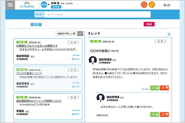- 『AI-PHARMA』から『CloseDi』へ、「掲示板機能」を提供します。『CloseDi』の利用者は、 『CloseDi』利用者同士、また『AI-PHARMA』利用者ともコミュニケーションを取ることが可能になります。(※1)