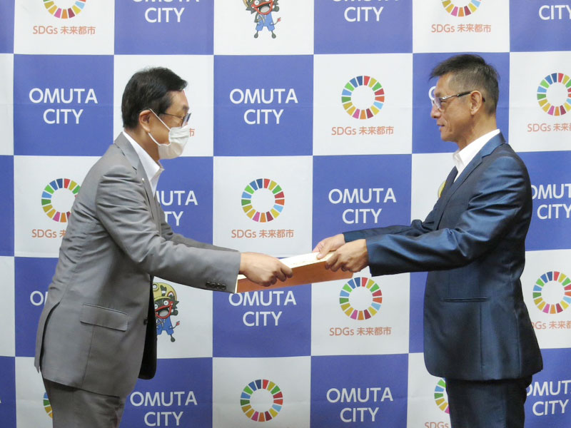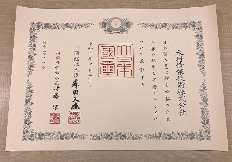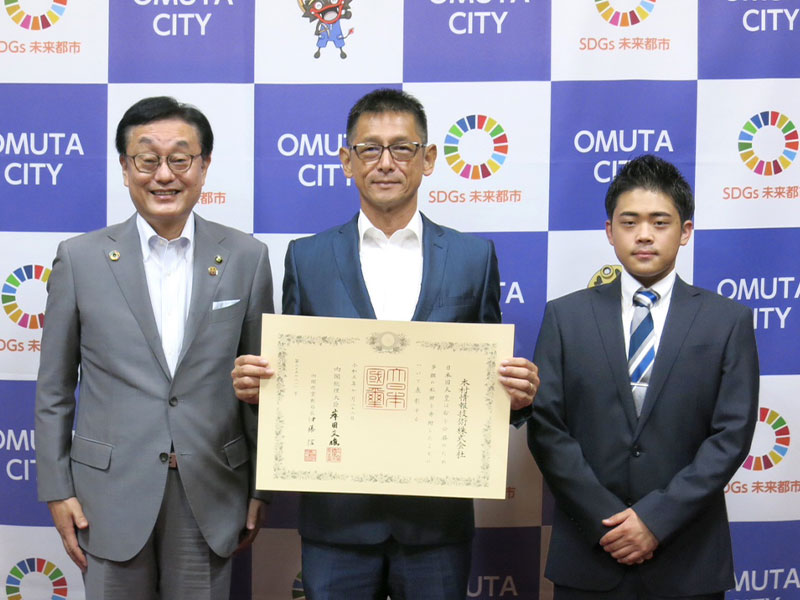 2023/09/26 お知らせ 木村情報技術は、福岡県大牟田市への寄附について、公益のために私財を寄附した個人や団体に贈られる「紺綬褒章」を受章しました。 なお、寄附金はイノベーション創出促進事業に活用されます。 (2023年9月25日 大牟田市庁舎にて)