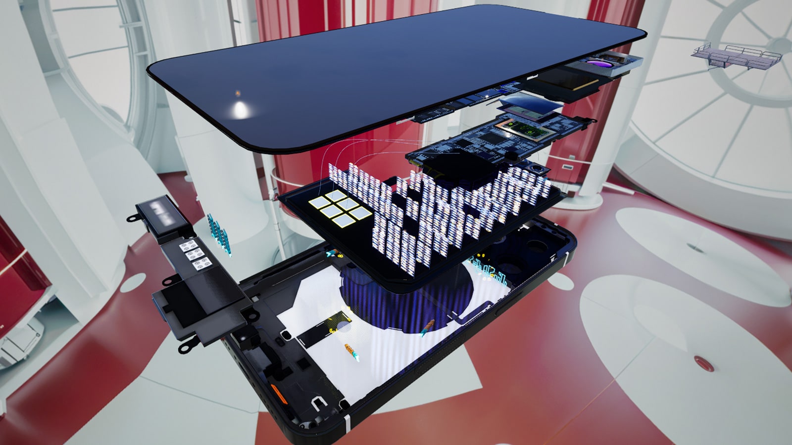 福岡大学のマップに入り、ロビーから半導体ゲームに進むと、スマホが分解される映像が流れます。それぞれの部品の場所を巡って、スマホ修理を体験できます。