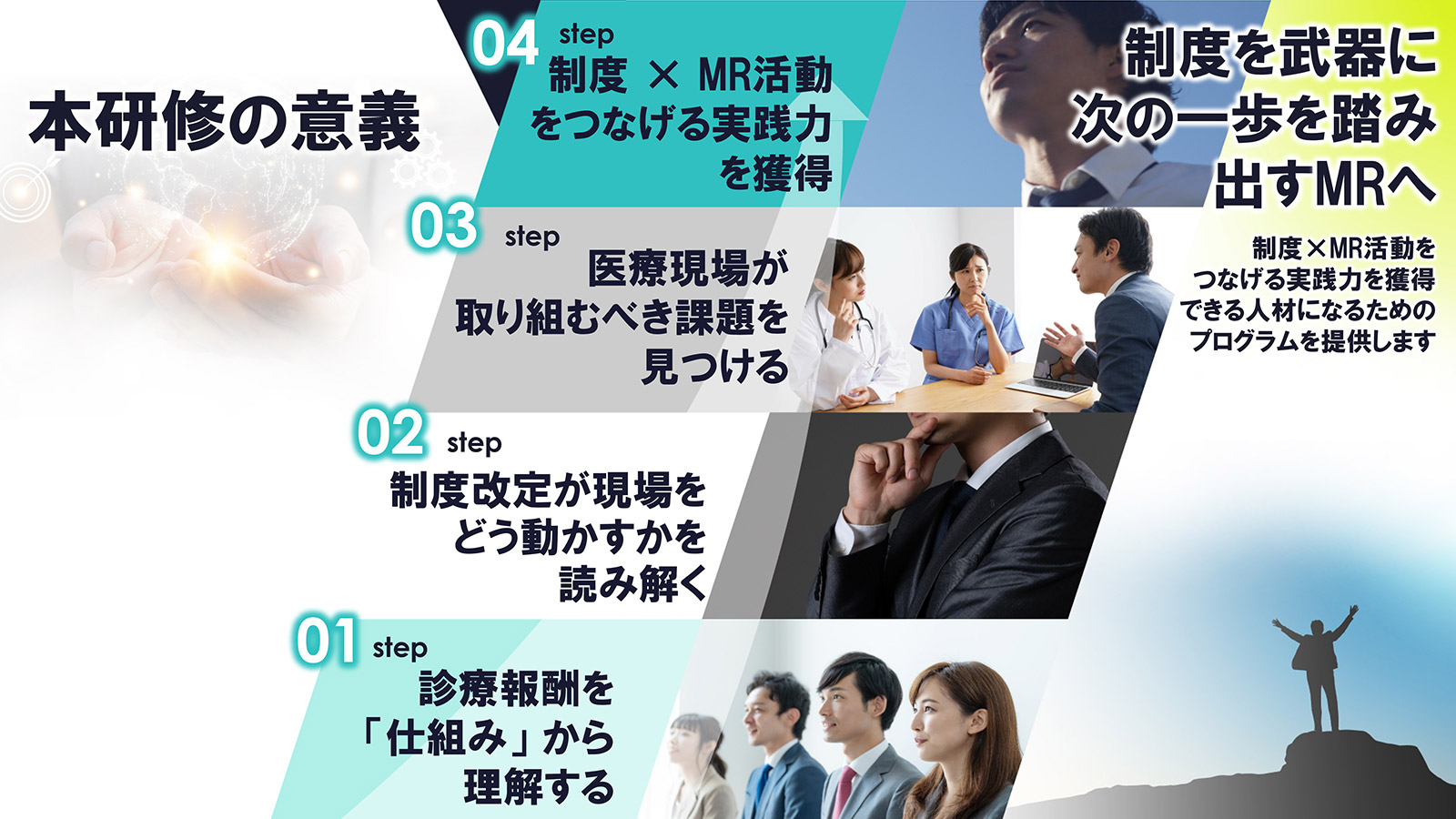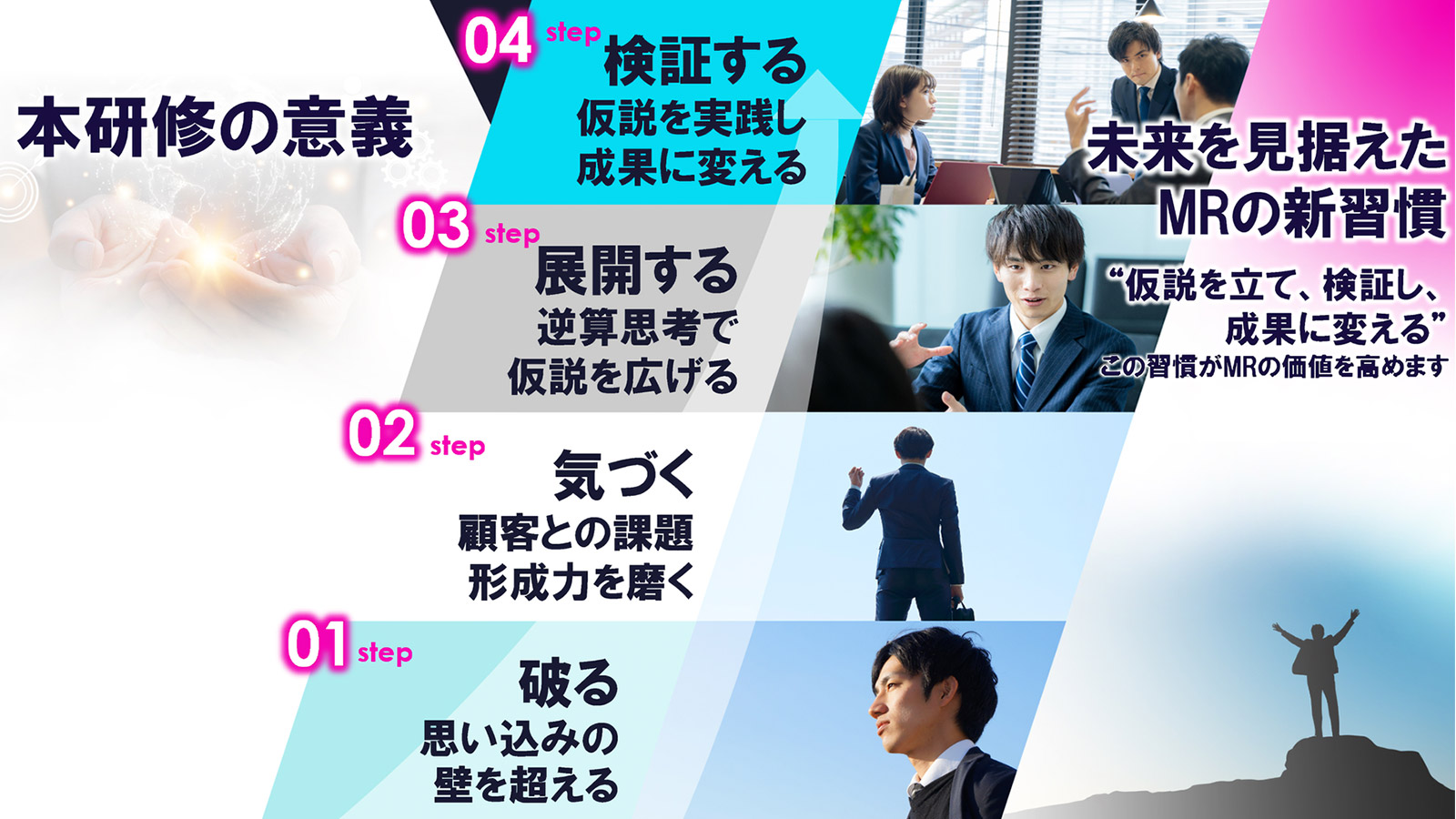 プログラムは「破る」「気づく」「展開する」「検証する」の4ステップで構成。さらに2040年の医療環境を見据えた未来志向のワークを取り入れ、仮説検証を日常的に実践する新習慣を築きます。