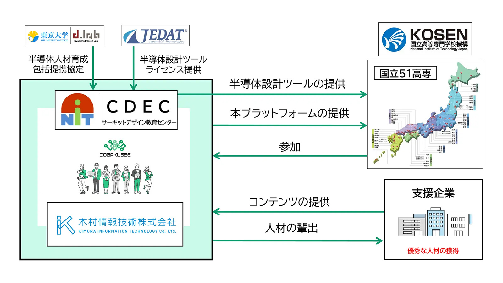 木村情報技術株式会社(本社:佐賀県佐賀市、代表取締役:木村 隆夫、以下「木村情報技術」)と有明工業高等専門学校(所在地:福岡県大牟田市、以下「有明高専」)は、全国の高専生(※1)を対象として共同開発した半導体人財共育プラットフォーム「COGAKUSEE(コウガクシー)」において、支援企業の募集を開始しました。