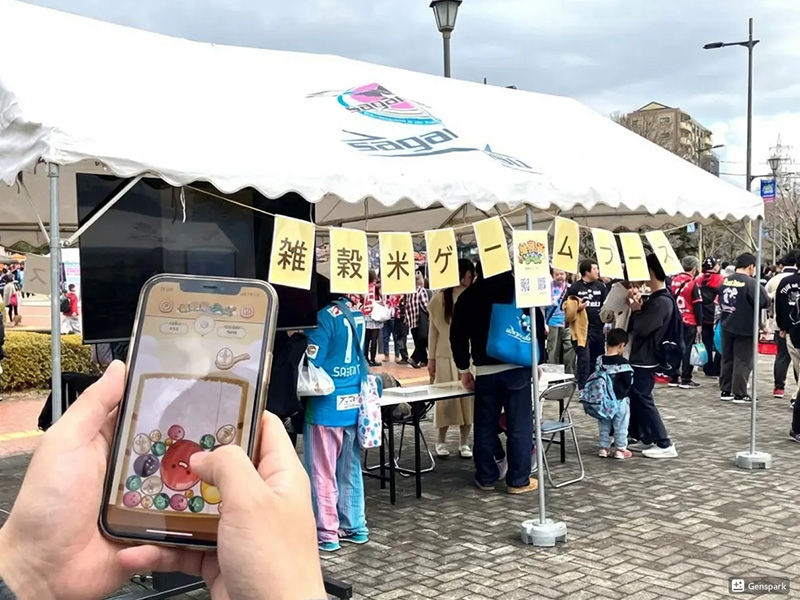 また、ゲート前では2月12日に配信を開始したスマートフォン向けパズルゲーム「雑穀米ゲーム」の体験ブースも出展。幅広い世代の来場者が立ち寄り、ゲームを楽しむ様子が見られました。
