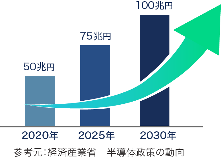 世界的な需要の増加に伴い、半導体製造装置製造業は増加傾向にあります。市場規模は右肩上がりという経済産業省の予測データがあります。