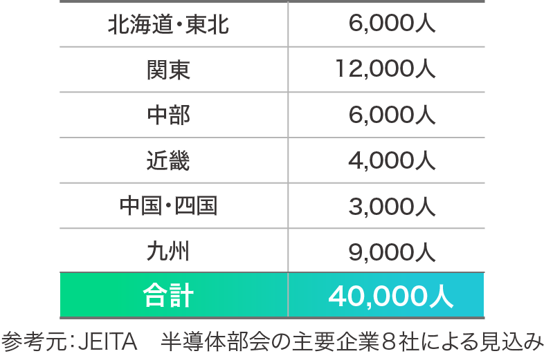 経済産業省の発表によると半導体人材の必要数は今後10年間で4万人は必要と言われています。