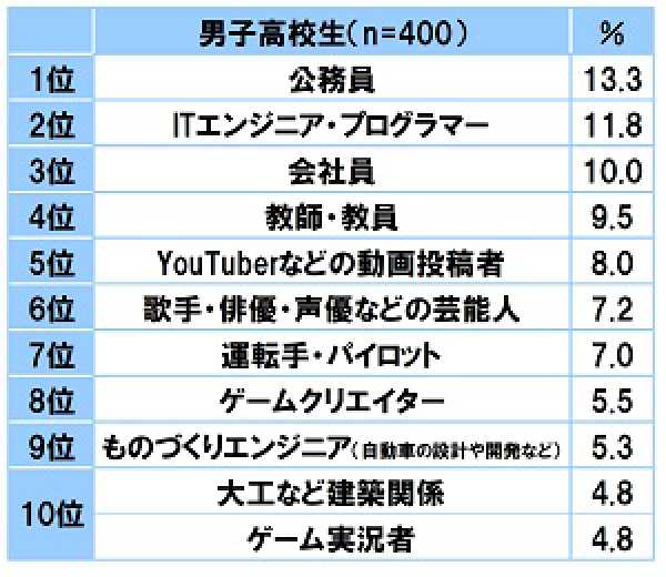 男子高校生の将来なりたい職業ではゲームクリエイターが8位、プログラマーが2位と人気です。